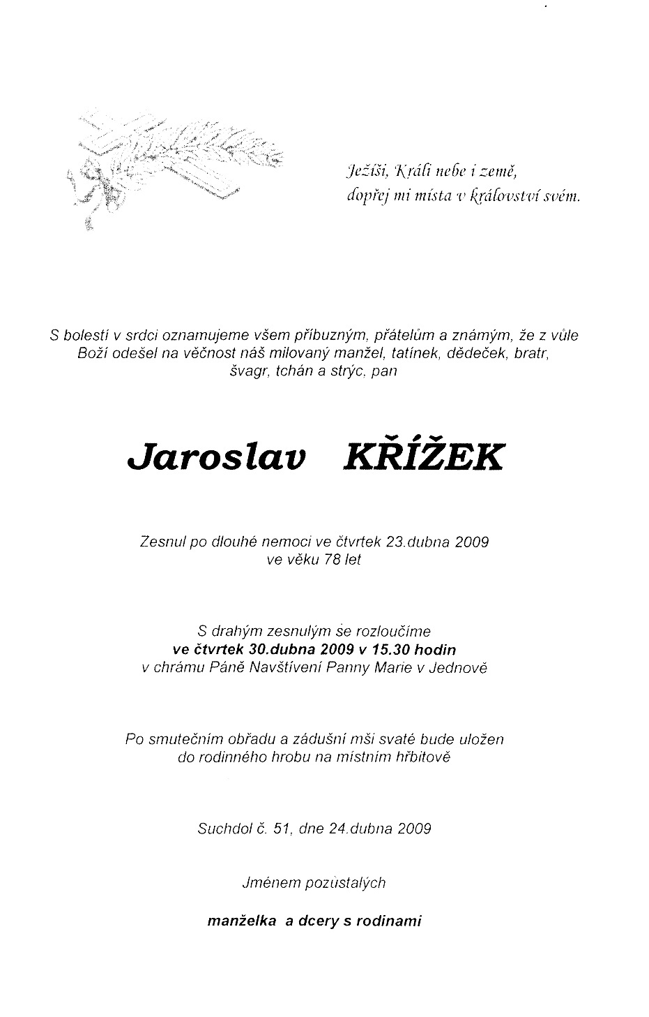 | Jaroslav Křížek | 1930 | Suchdol 51 | 23.04.2009 | parte |